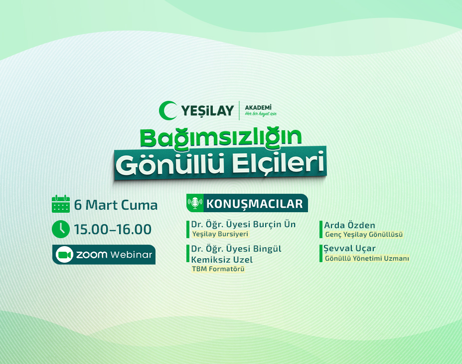 1–7 Mart Yeşilay Haftası kapsamında gerçekleştirilecek bu webinarda, Yeşilay’ın gönüllülük faaliyetleri ve sahadaki çalışmaları ele alınacaktır. Programda, gönüllülerin yürüttüğü etkinlikler, saha uygulamaları ve toplumsal farkındalık çalışmalarının nasıl planlandığı ve hayata geçirildiği aktarılacaktır.